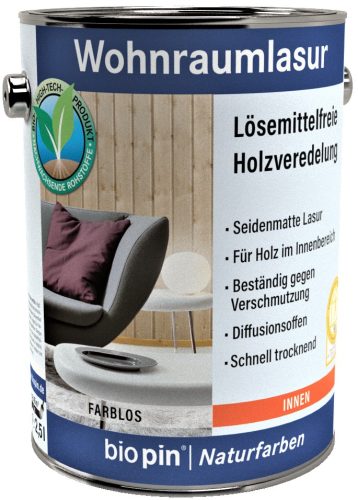 Szín: színtelen, fehér, a biopin Beltéri lazúr nedves állapotban tejszerű. Végső színét száradás után nyert el. A minták fenyőfára készültek, más fafajokon más pácképet kaphatunk.