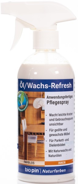 A biopin olaj-/viaszos-frissítő egy tökéletesen összehangolt ápoló spray természetes viasszal és természetes olajokkal minden olajozott és viaszolt bútorfelülethez, parkettához és padlóhoz. Frissítésre és védelemre, valamint enyhe karcolások és az enyhe kopásnyomok megszüntetésére. Rövid száradási idő után a kezelt felület selyemfényű (polírozás nélkül), szennyeződés taszító és jobban ellenáll a mechanikai kopásnak.
