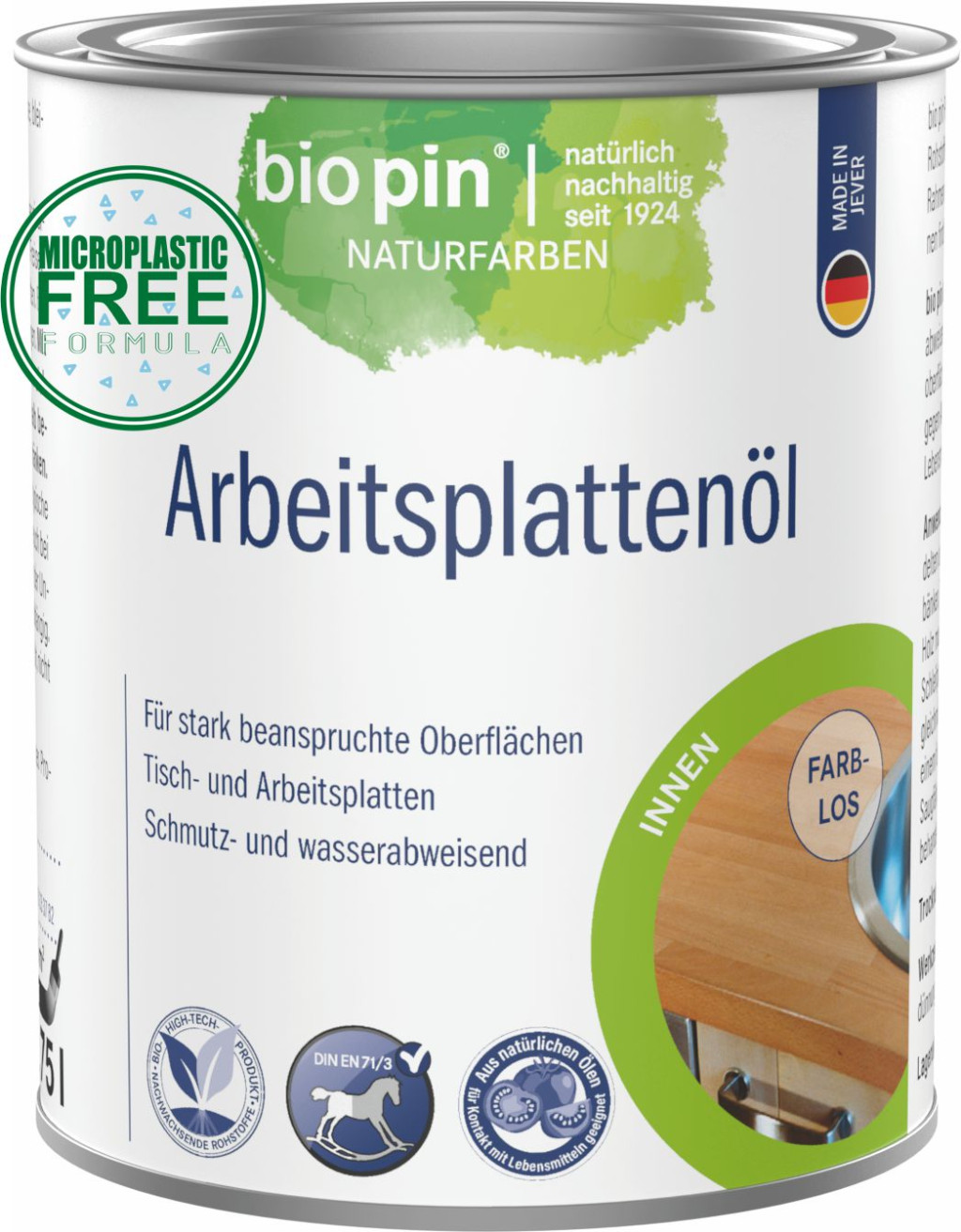 A biopin Munkalapolaj egy légáteresztő, szennyeződés- és vízlepergető fakezelő szer, amely ragyogó, selyemfényű fafelületet hoz létre. A fa tónusa intenzívebbé válik. Rendkívül ellenálló a kopással és a szokásos háztartási folyadékokkal szemben. Alkalmas élelmiszerekkel és gyermekjátékokkal való érintkezésre a DIN EN 71/3 szabvány szerint.